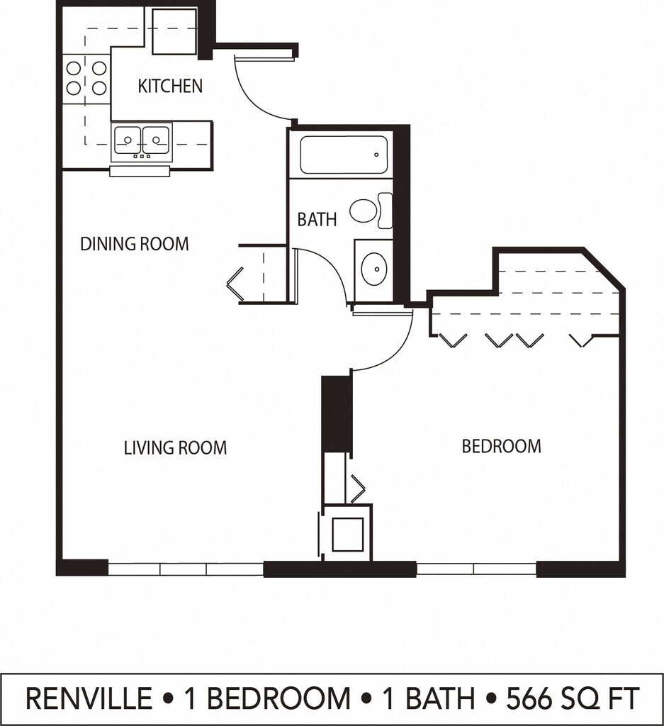 Modelo de apartamento: Renville$1,4791 Dormitorio, 1 Baño, 566 sq ftDisponible Ahora![]()