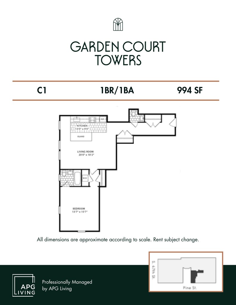 En la encantadora Pine Street del oeste de Filadelfia, Garden Court Plaza Apartments está ubicado convenientemente en el vecindario de University City y tiene una amplia variedad de apartamentos tipo estudio, y de una, dos y tres habitaciones. Este hermoso edificio estilo art déco ofrece algunas de las mejores comodidades, que incluyen detalles históricos originales, imponentes vistas de Filadelfia, un enorme y peculiar espacio de jardín, un garaje de estacionamiento adjunto, pisos de madera noble restaurados y una gran cantidad de amor por tus mascotas. Garden Court Apartments está administrado por Spruce Street Commons, un negocio a nivel local que nació y creció por dedicarse meticulosamente a la preservación histórica, por ser obsesivos con la atención a los detalles y el cuidado máximo de nuestros residentes.