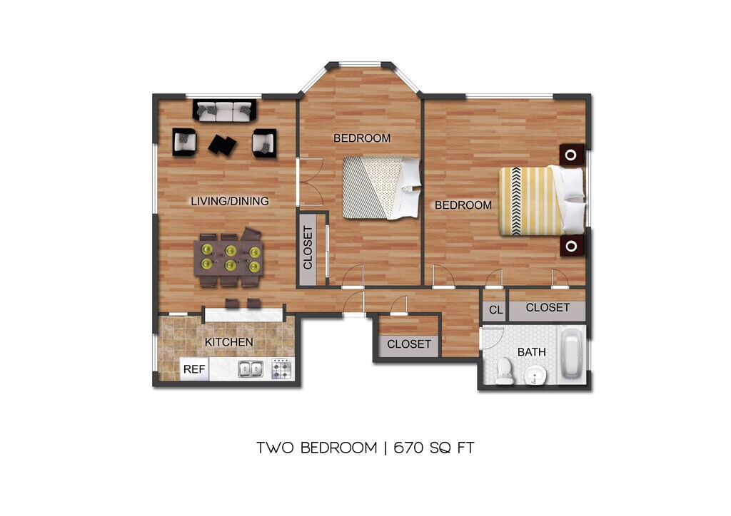 2 Dormitorios, 1 Baño, 670 pies²Precio Mensual TotalDisponible March 1, 2026Galería del Modelo