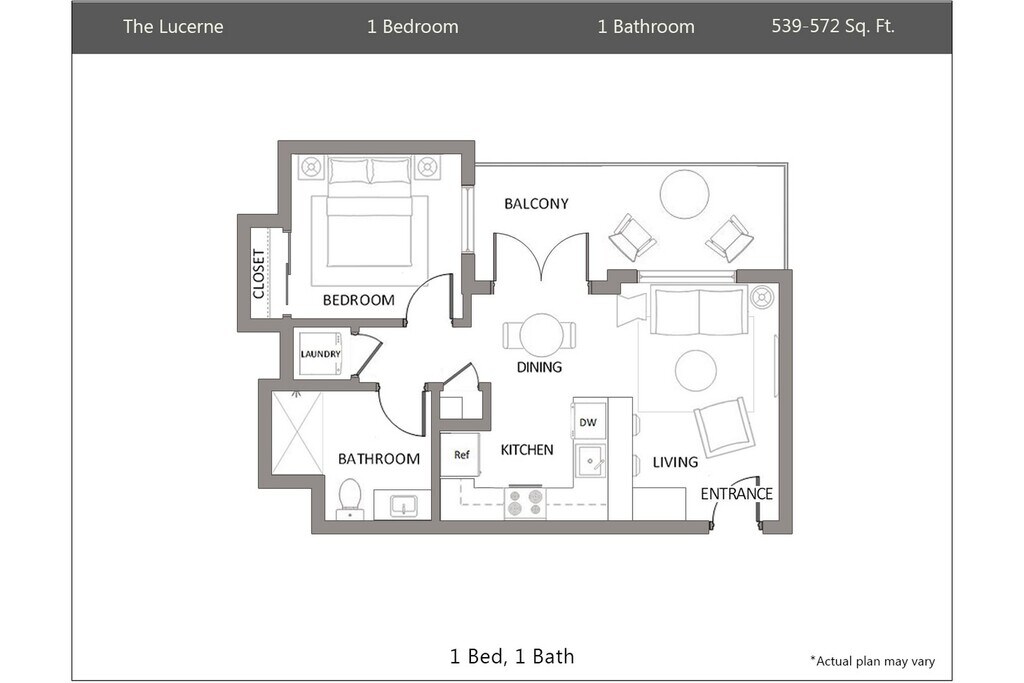 1 Dormitorio, 1 Baño, 539-572 pies²Disponible AhoraGalería del Modelo