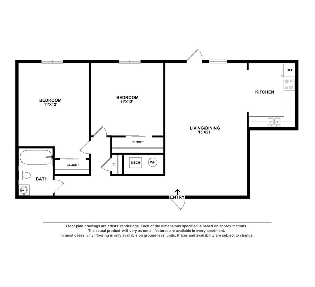 2 Dormitorios, 1 Baño, 950 pies²Disponible AhoraGalería del Modelo