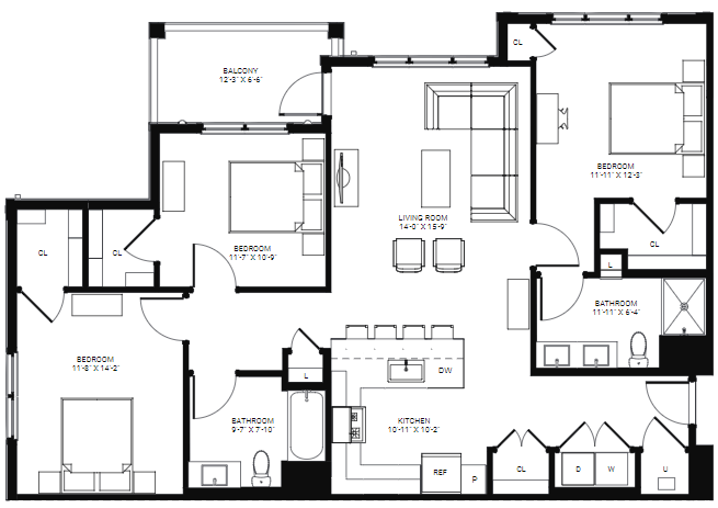 Modelo de apartamento: A1Desde $3,0191 Dormitorio, 1 Baño, 881 sq ftDisponible November 28, 2025PlanosFotos![]()