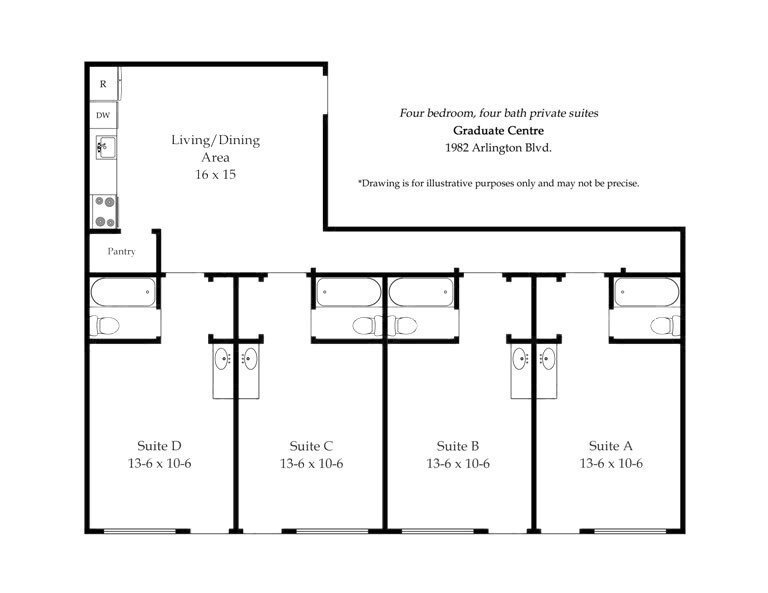 Vive con otros estudiantes en Graduate Centre y ahorra tiempo, dinero, y energía! Toma un corto paseo a North terrenos y la vecina de supermercados, restaurantes, y tiendas en Barracks Road. Vive de manera cómoda con un alquiler asequible. Cada suite cuenta con un habitación y baño privado, entrada privada, y contratos de arrendamiento individuales. Último piso, las habitaciones tienen un tragaluz y un entrepiso estilo loft. Los alquileres varían desde $599-$670. Cargo adicional de $125 mensuales para Wi-Fi, electricidad, agua, alcantarillado, recolección de residuos, y el gas. Este hotel solo admite los estudiantes de tiempo completo.