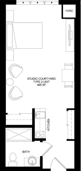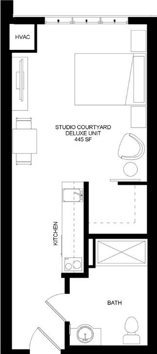 Fecha Disponibilidad Unidad Pies² No Disponible Studio Courtyard - Deluxe 445 pies² Características y Comodidades de Modelo