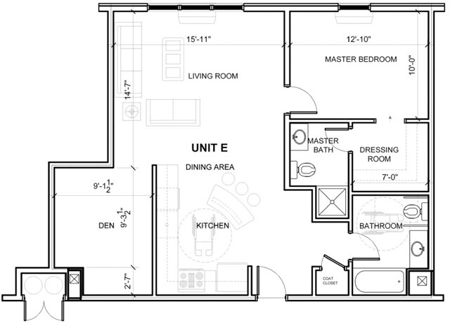 Modelo de apartamento: FLOORPLAN E w/ DEN$2,3501 Dormitorio, 2 Baños, 873 sq ftDisponible April 11, 2026![]()