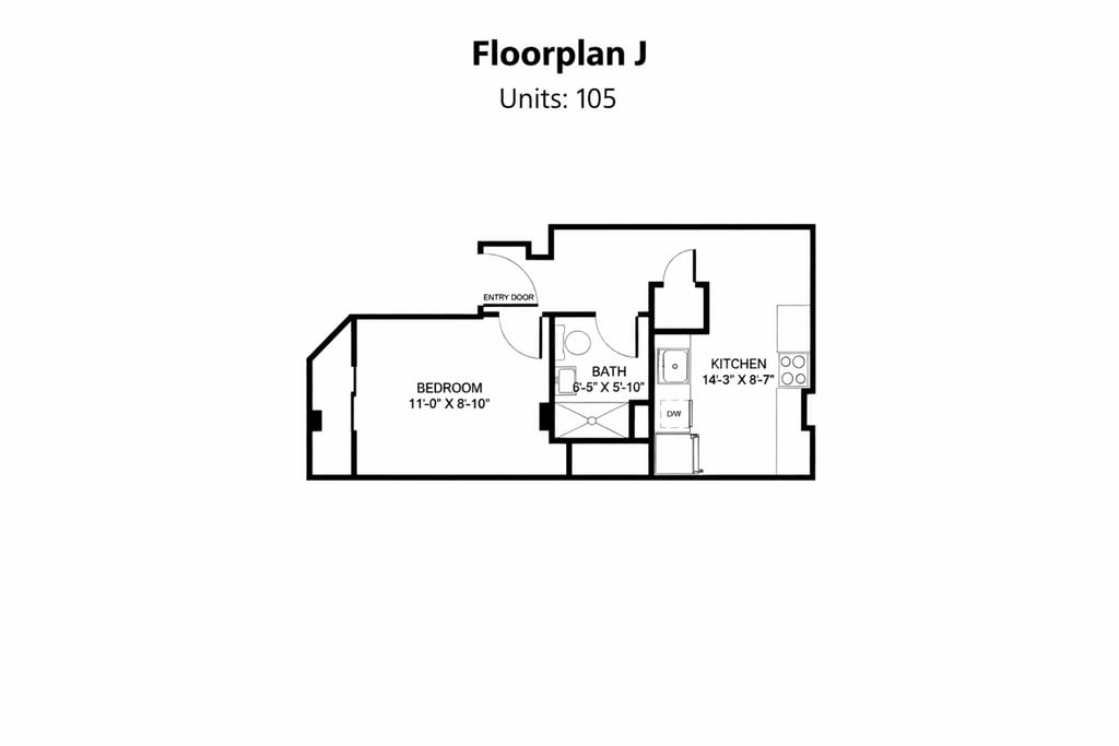J - Plano 1 Unidad de apartamento: 105Modelo de apartamento: J$6501 Dormitorio, 1 Baño, 358 sq ftDisponible August 10, 2026![]()
