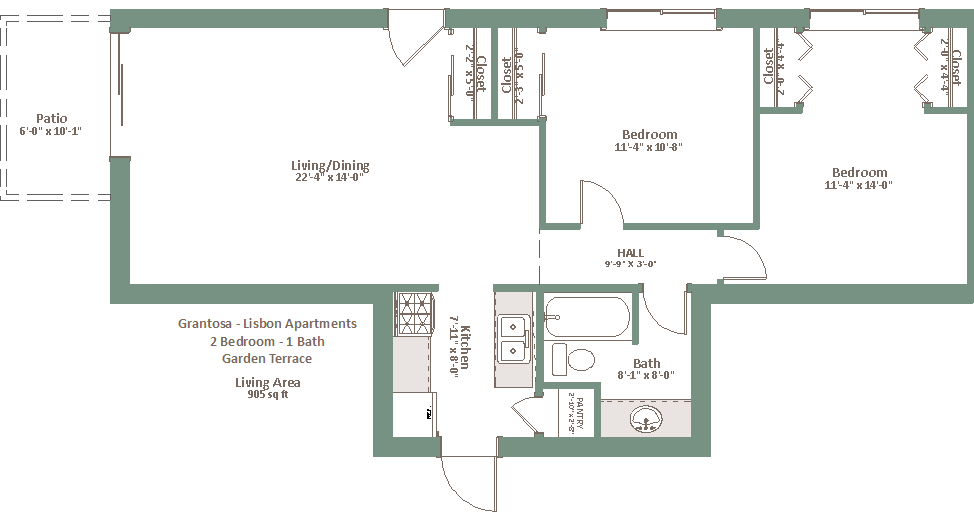 Fecha Disponibilidad Unidad Pies² No Disponible Garden Terrace 905 pies² Modelo de apartamento: Garden Terrace2 Dormitorios, 1 Baño, 905 sq ftNo Disponible![]()