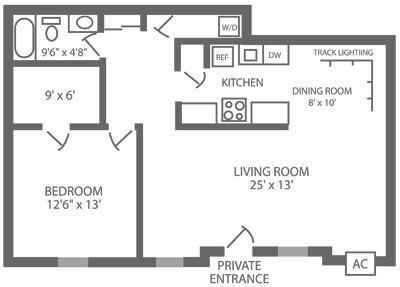 Modelo de apartamento: 1 Bed | 1 Bath | Private EntranceLlame para Precios1 Dormitorio, 1 Baño, 950 sq ftNo Disponible1 Bed | 1 Bath | Private Entrance - Plano 1 2 Dormitorios