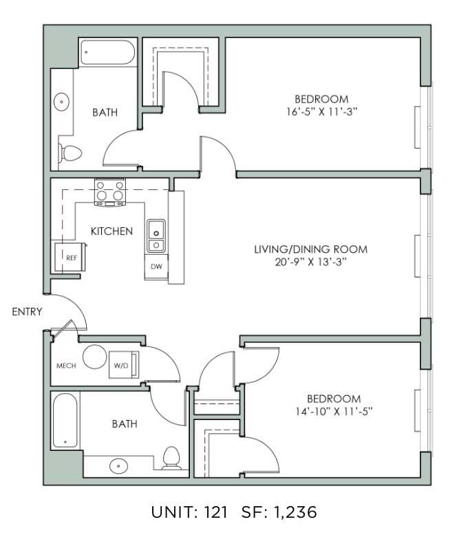 GP121 - Plano Unidad de apartamento: 121Modelo de apartamento: GP1212 Dormitorios, 2 Baños, 1236 sq ftDisponible Ahora![]()