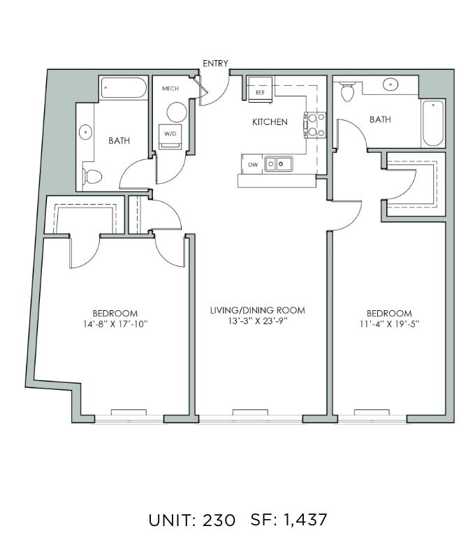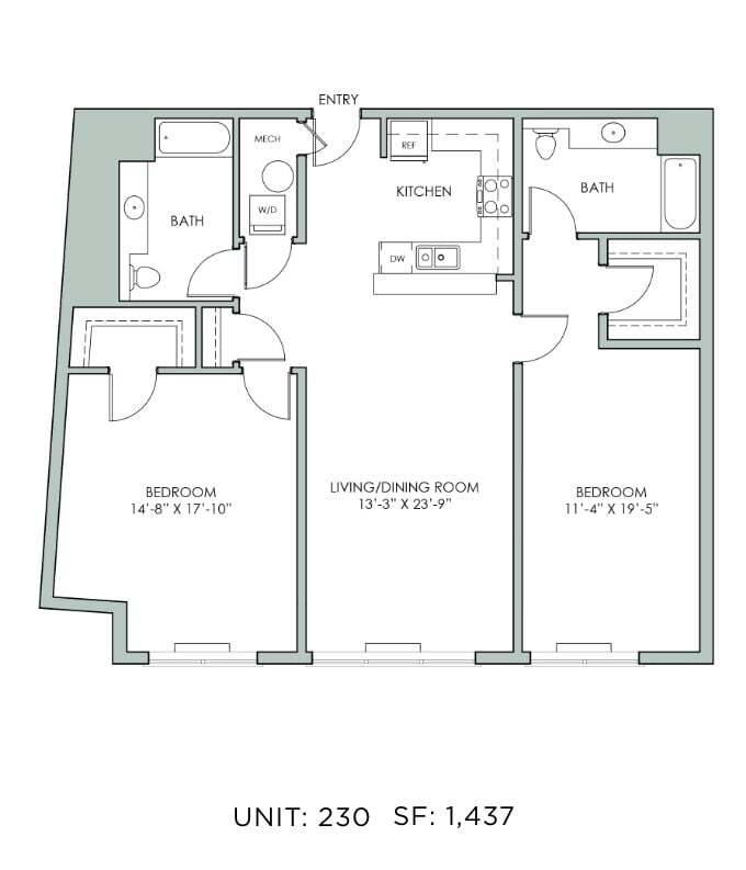 GP230 - Plano Unidad de apartamento: 230Modelo de apartamento: GP2302 Dormitorios, 2 Baños, 1437 sq ftDisponible Ahora![]()