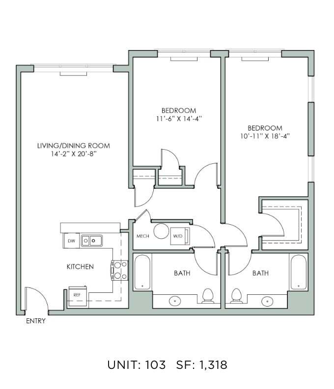 GP103 - Plano Unidad de apartamento: 103Modelo de apartamento: GP1032 Dormitorios, 2 Baños, 1318 sq ftDisponible Ahora![]()