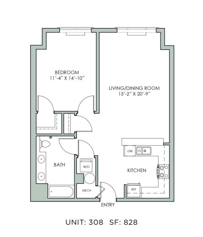 GP308 - Plano Unidad de apartamento: 308Modelo de apartamento: GP3081 Dormitorio, 1 Baño, 828 sq ftDisponible Ahora![]()