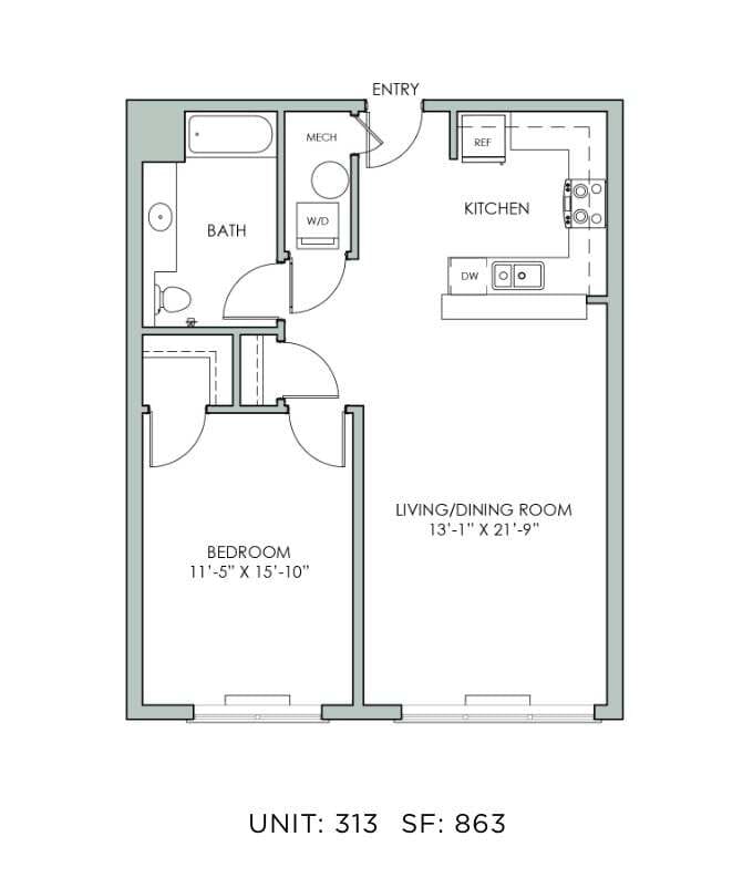 GP313 - Plano Unidad de apartamento: 313Modelo de apartamento: GP3131 Dormitorio, 1 Baño, 863 sq ftDisponible Ahora![]()
