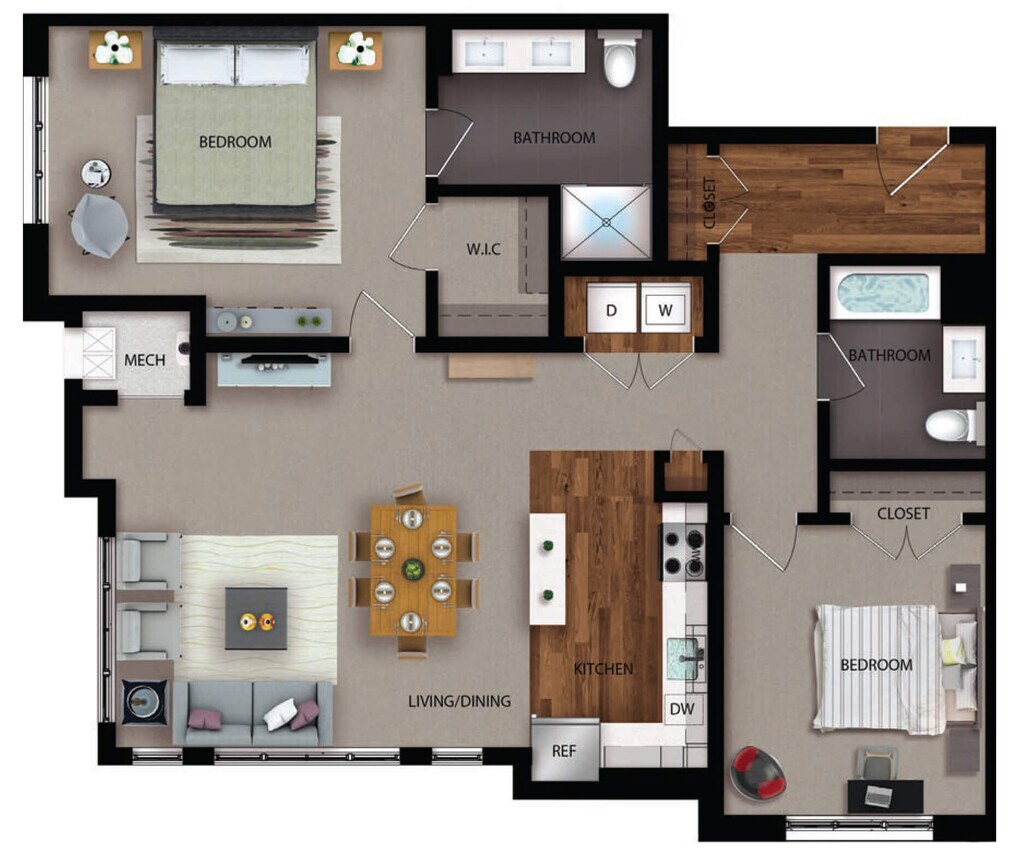 1 Dormitorio, 1 Baño, 855 pies²Disponible AhoraGalería del Modelo