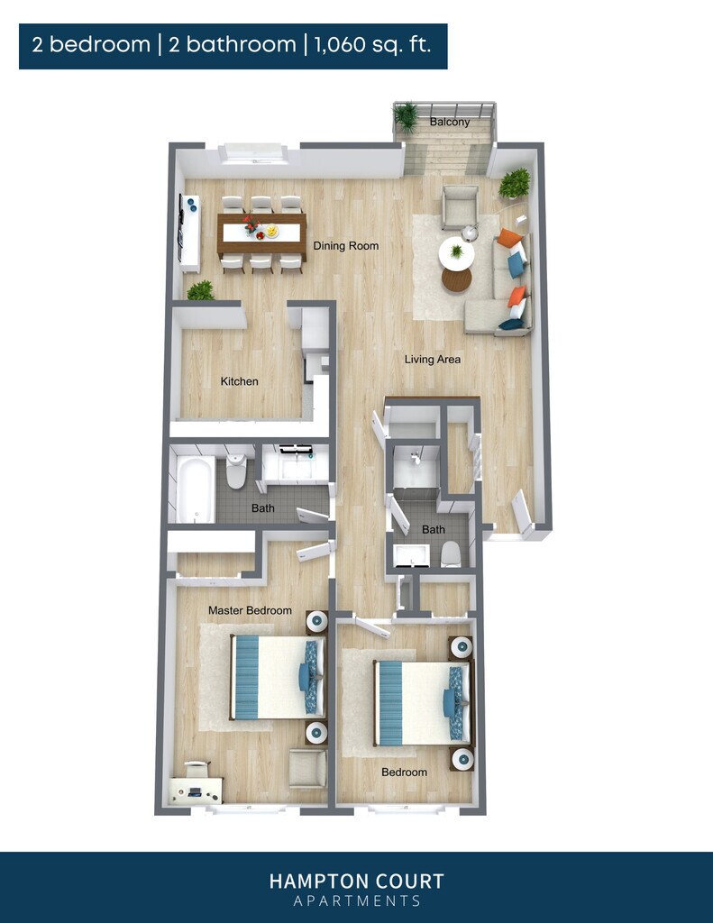 Hampton Court ofrece apartamentos de 1 a 2 Dormitorios desde $1,040 con 760–1,060 pies cuadrados. Aquí está el precio actual y la disponibilidad: