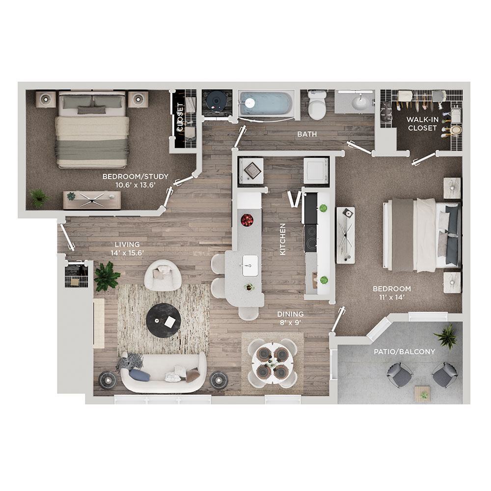 Modelo de apartamento: B$1,4351 Dormitorio, 1 Baño, 850 sq ftDisponible May 30, 2026![]()