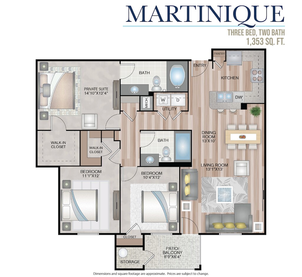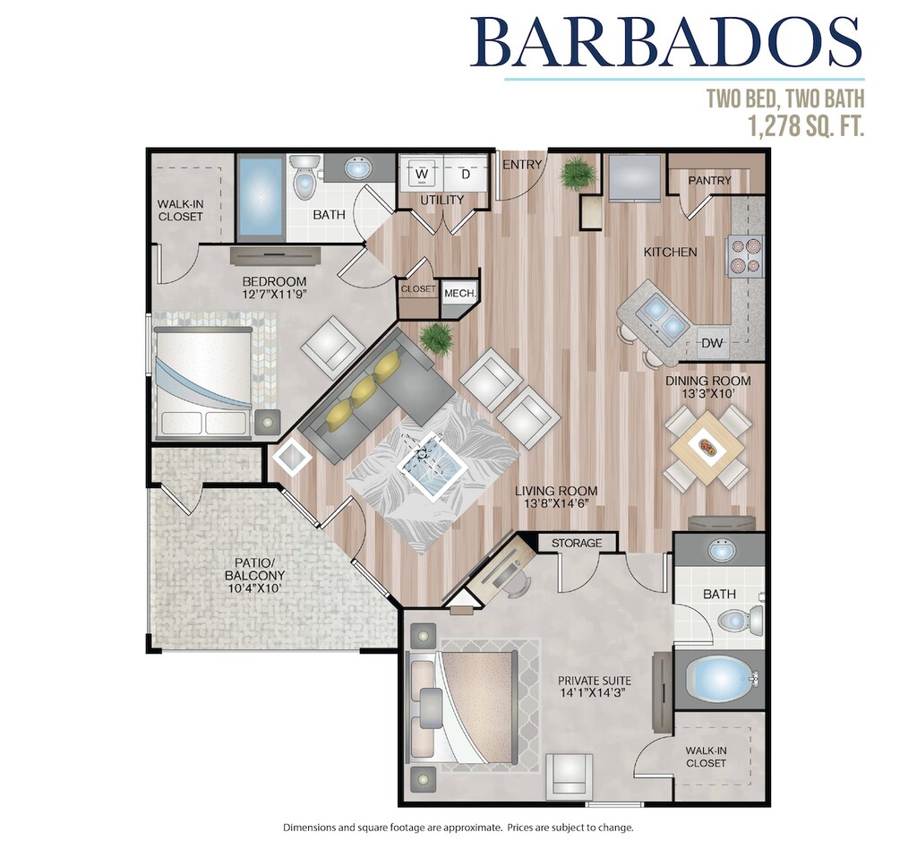 Modelo de apartamento: Nevis1 Dormitorio, 1 Baño, 809 sq ftDisponible AhoraPlanosFotos![]()