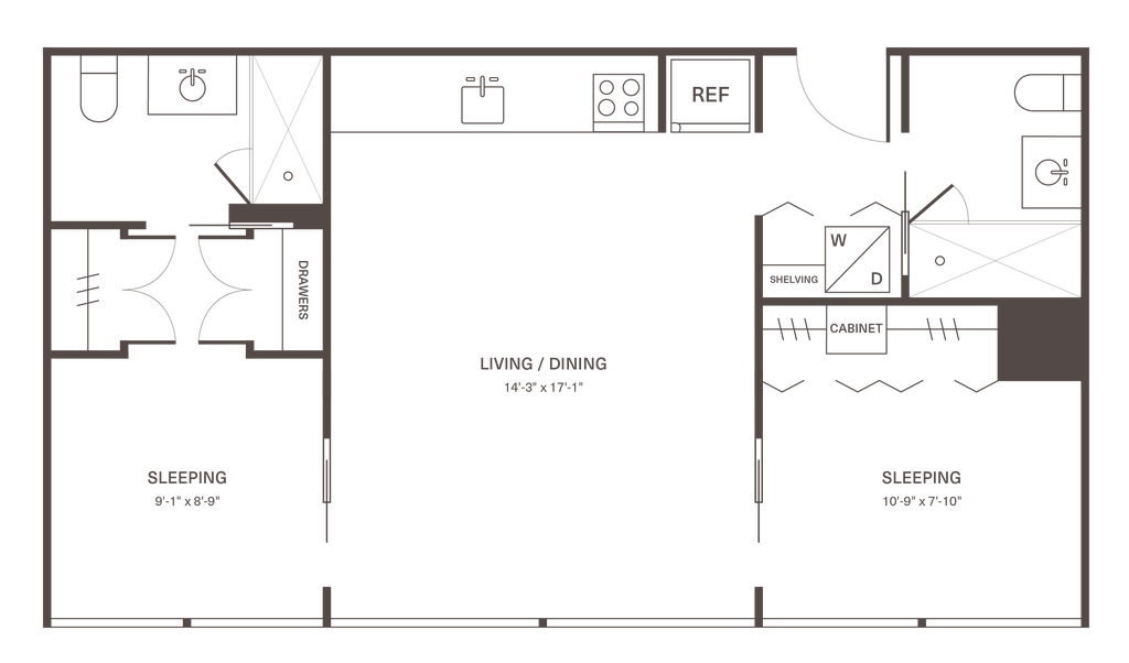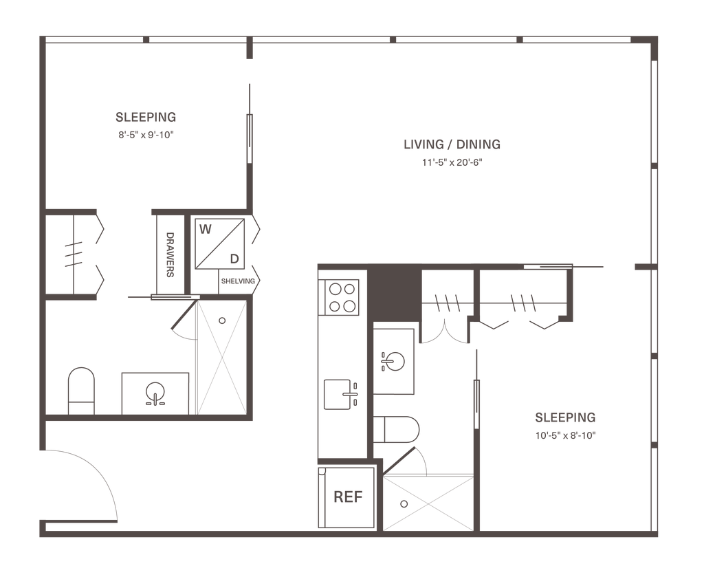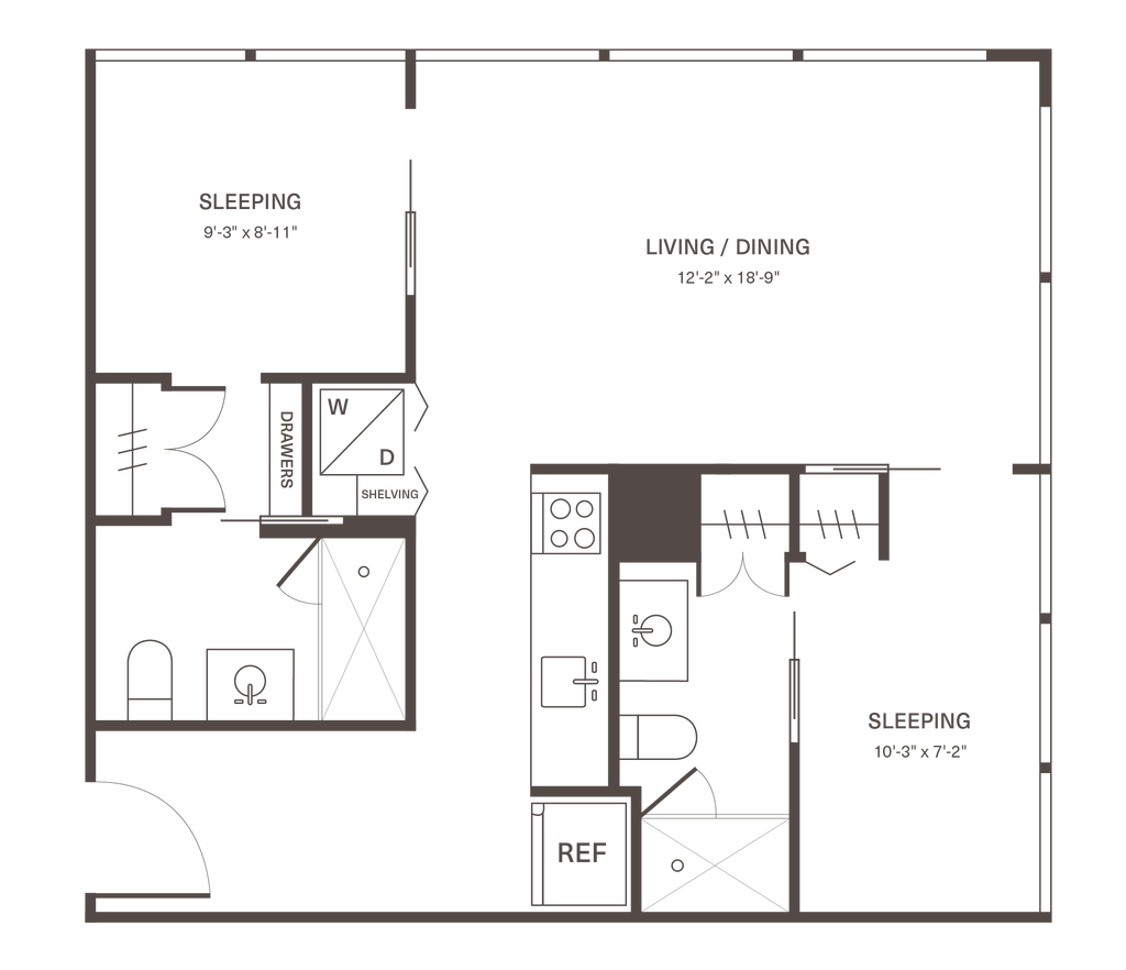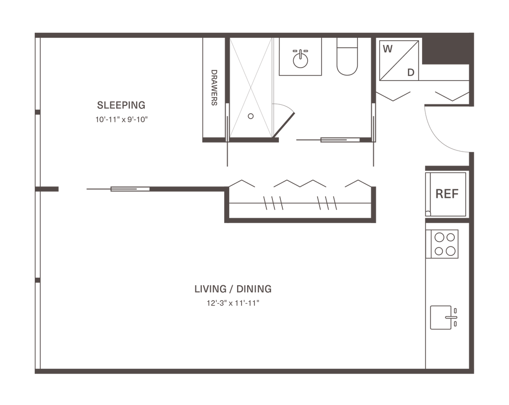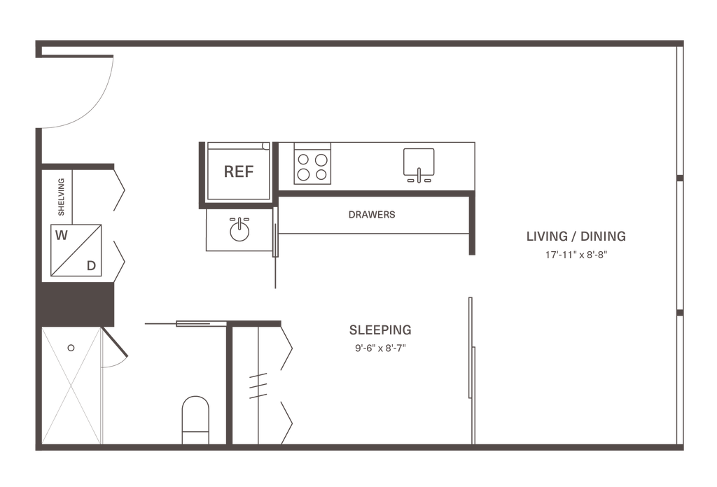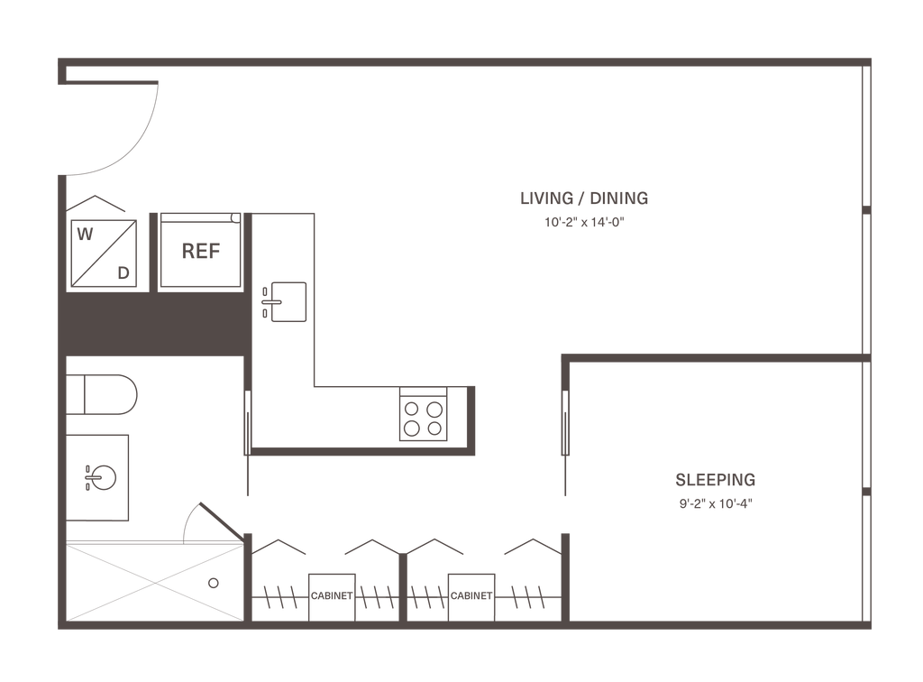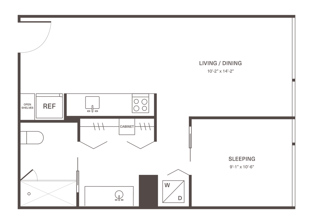 Estudio, 1 Baño, 480 pies²Disponible AhoraEl más grandeEsta opción tiene las unidades más grandes para este modeloGalería del Modelo