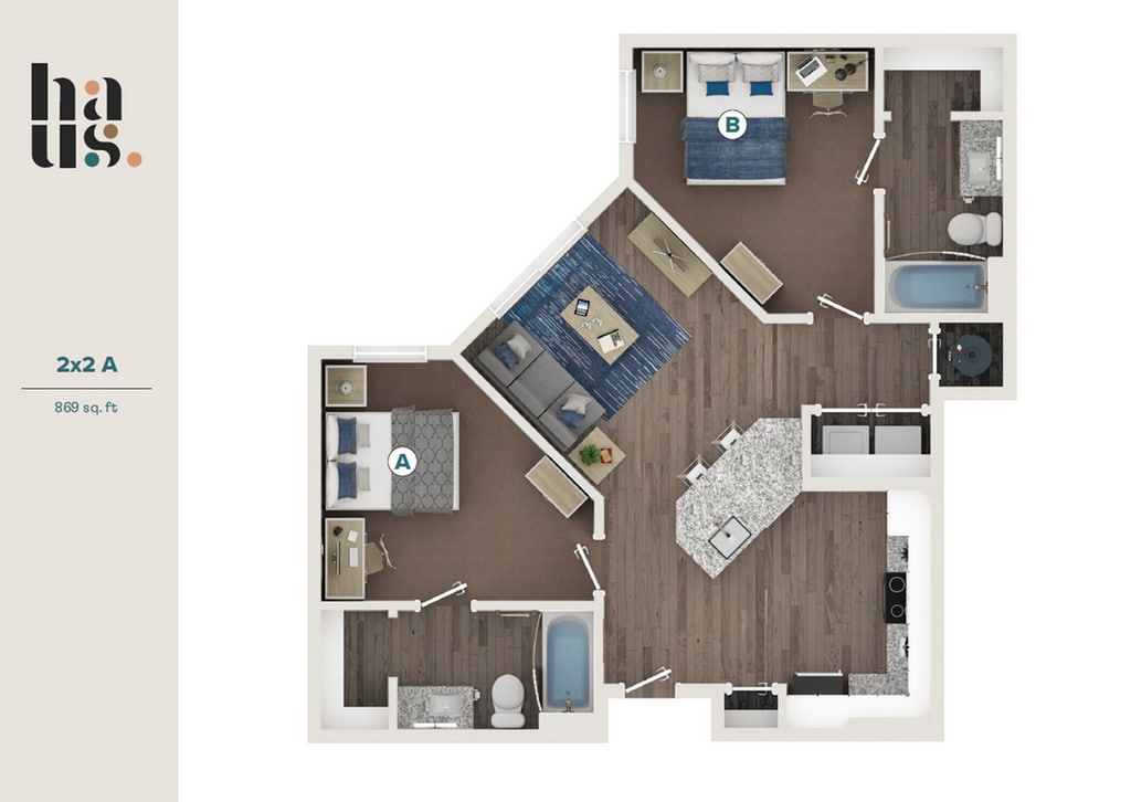 2 Dormitorios, 2 Baños, 829-869 pies²Disponible August 14, 2026Galería del Modelo