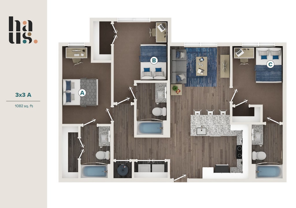 Modelo de apartamento: 3x3$1,3753 Dormitorios, 3 Baños, 1082 sq ftDisponible August 14, 20263x3 - Plano 1 Unidad de apartamento: PrivateModelo de apartamento: 3x3$1,3753 Dormitorios, 3 Baños, 1082 sq ftDisponible August 14, 2026