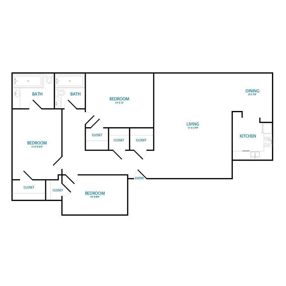 3 Dormitorios, 2 Baños, 982 pies²Galería del Modelo