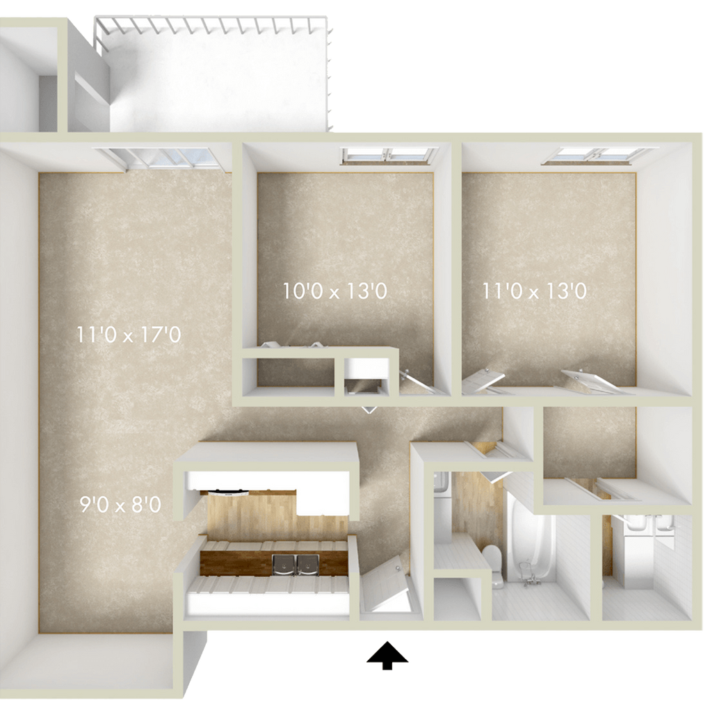 Modelo de apartamento: 1BR 1BA 728SQFT 80%Desde $1,6901 Dormitorio, 1 Baño, 728 sq ftDisponible Ahora![]()