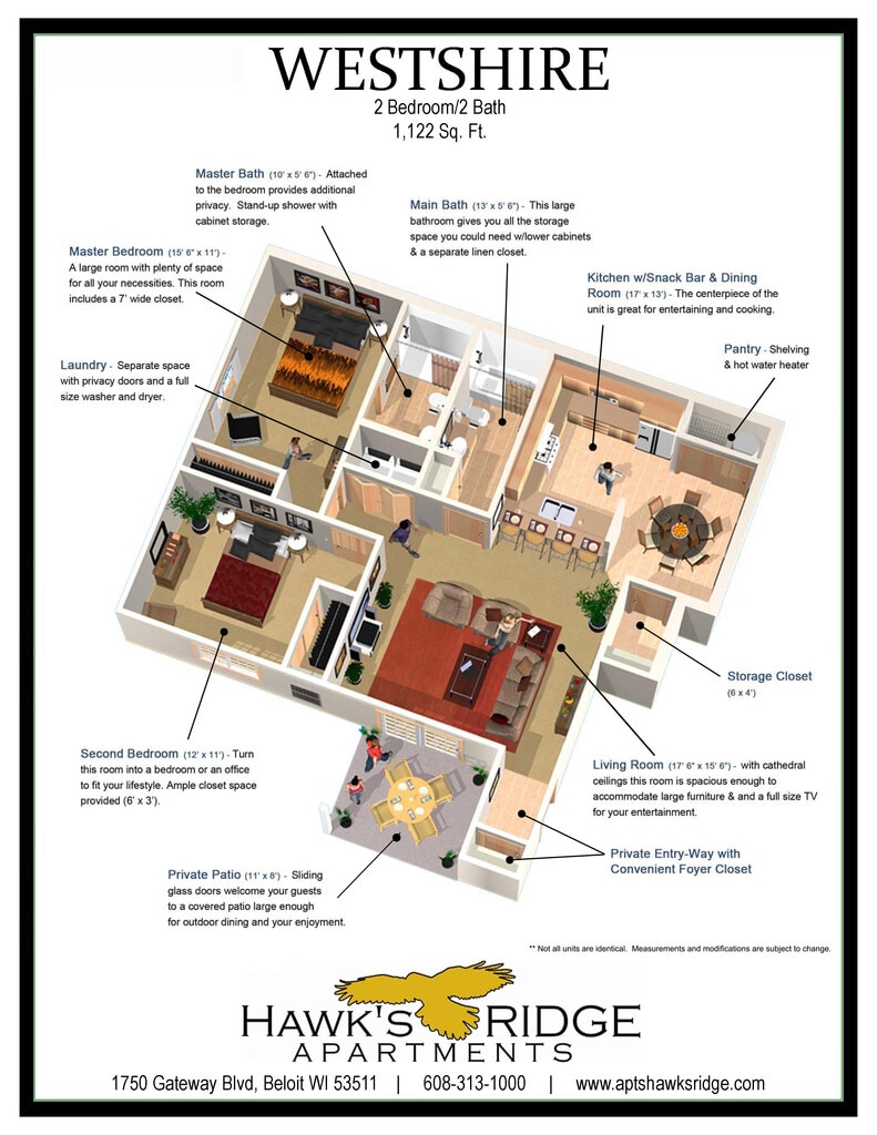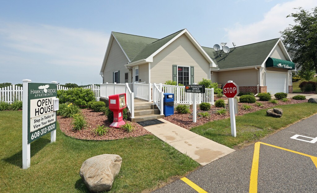 Hawks Ridge Apartments está ubicado en uno de los puntos más altos en Rock County. Con vistas panorámicas de la zona, esta excelente ubicación ofrece todas las comodidades del hogar y un conveniente acceso a las autopistas 43 y I-90 para viajar diariamente. Hawks Ridge Apartments ofrece amplios apartamentos de una, dos o tres habitaciones con entradas privadas, estacionamiento subterráneo, lavadora y secadora en el apartamento, aire acondicionado y calefacción centralizados, almacenaje privado, vestidores, y mucho más. La casa club cuenta con una piscina al aire libre, un gimnasio y una instalación con cocina para banquetes. Para apreciar todo lo que Hawks Ridge Apartments tiene para ofrecer, visítanos para que lo veas por ti mismo.