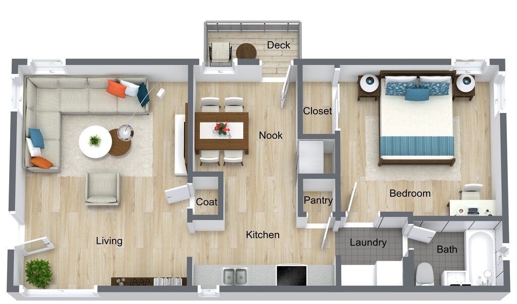 1 Dormitorio, 1 Baño, 900 pies²Disponible AhoraEl más grandeEsta opción tiene las unidades más grandes para este modeloGalería del Modelo