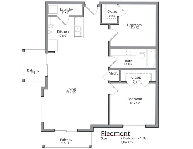 Modelo de apartamento: PiedmontLlame para Precios2 Dormitorios, 1 Baño, 1059 sq ftNo Disponible![]()