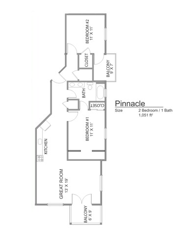 Modelo de apartamento: PinnacleLlame para Precios2 Dormitorios, 1 Baño, 1069 sq ftNo Disponible![]()