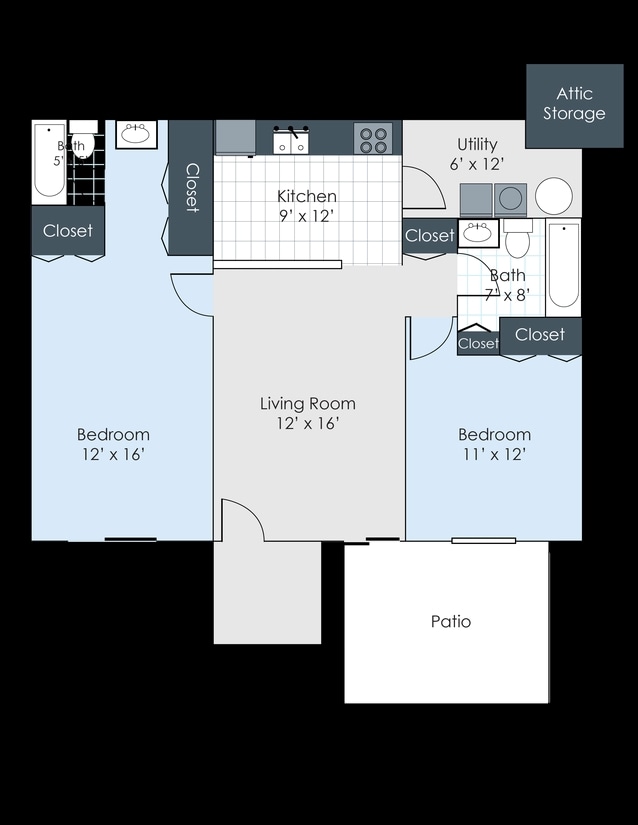 Modelo de apartamento: 2 Bed 1 BathDesde $8802 Dormitorios, 1 Baño, 864 sq ftDisponible Ahora![]()