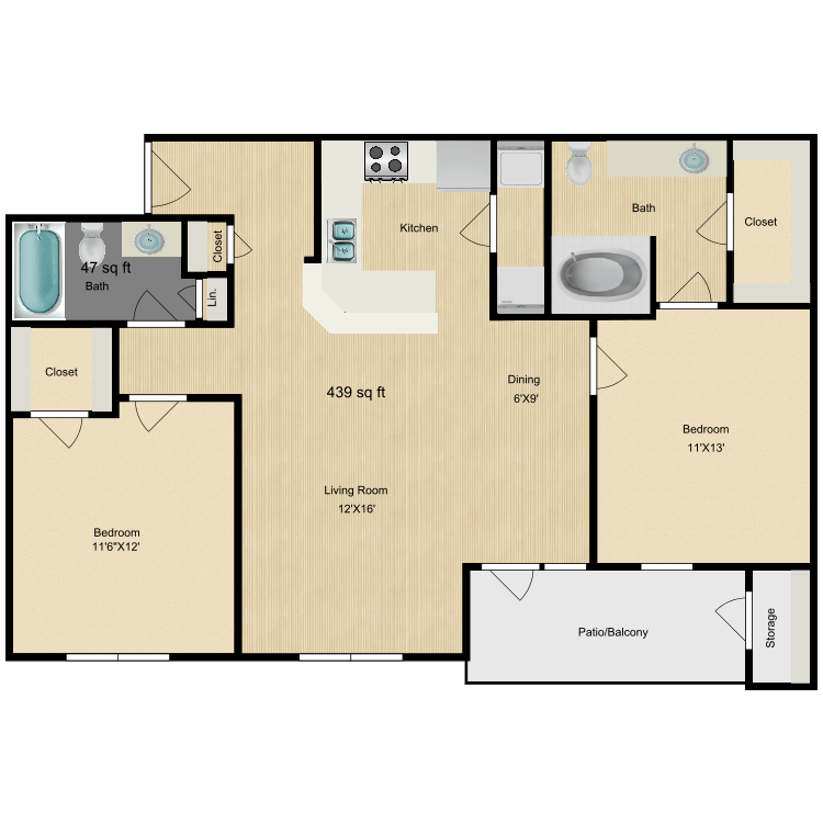 Modelo de apartamento: A1Desde $1,0291 Dormitorio, 1 Baño, 668 sq ftDisponible Ahora![]()
