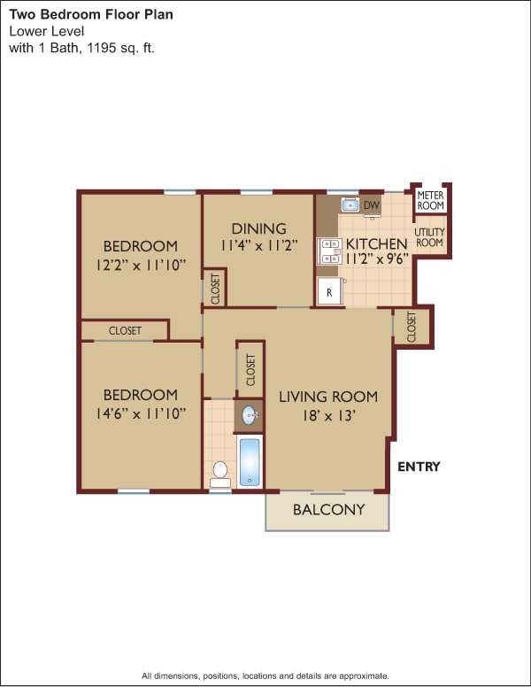 Modelo de apartamento: $1.79/sq.ft. - Two BedroomDesde $2,1452 Dormitorios, 1 Baño, 1195 sq ftNo Disponible![]()