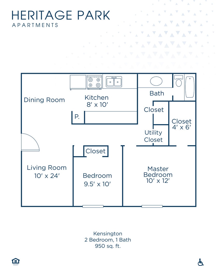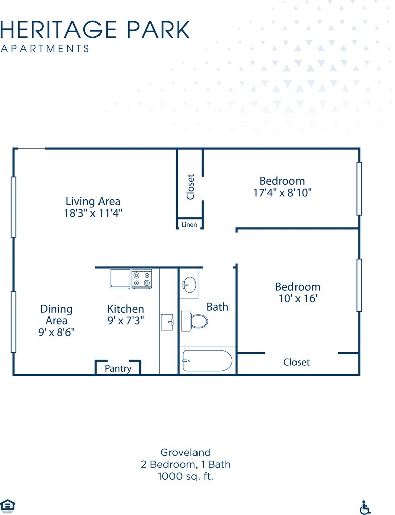 Modelo de apartamento: 2 Bedroom ApartmentDesde $1,0242 Dormitorios, 1 Baño, 950 sq ftDisponible AhoraPlanosFotos![]()