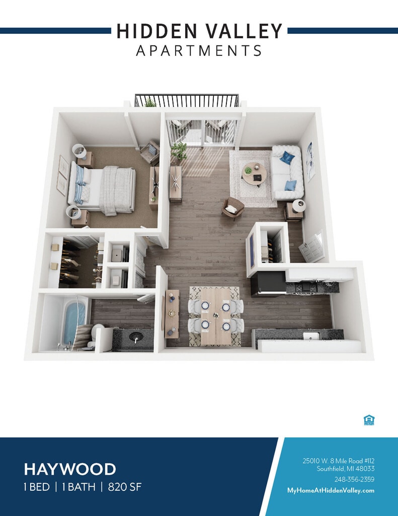 Modelo de apartamento: Haywood$9701 Dormitorio, 1 Baño, 820 sq ftDisponible AhoraPlanosFotosHaywood - Imagen 1 Haywood - Plano 2 Unidad de apartamento: 101005Modelo de apartamento: Haywood$9701 Dormitorio, 1 Baño, 820 sq ftDisponible Ahora2 Dormitorios