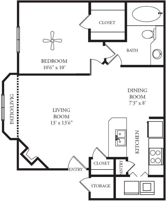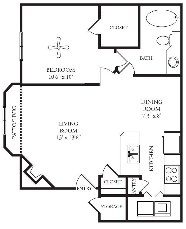 Modelo de apartamento: Bristol 1$1,0351 Dormitorio, 1 Baño, 578 sq ftDisponible Ahora![]()