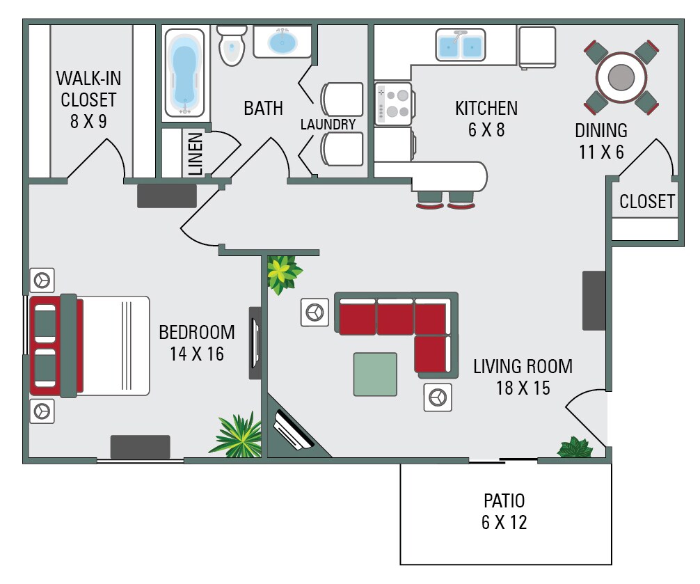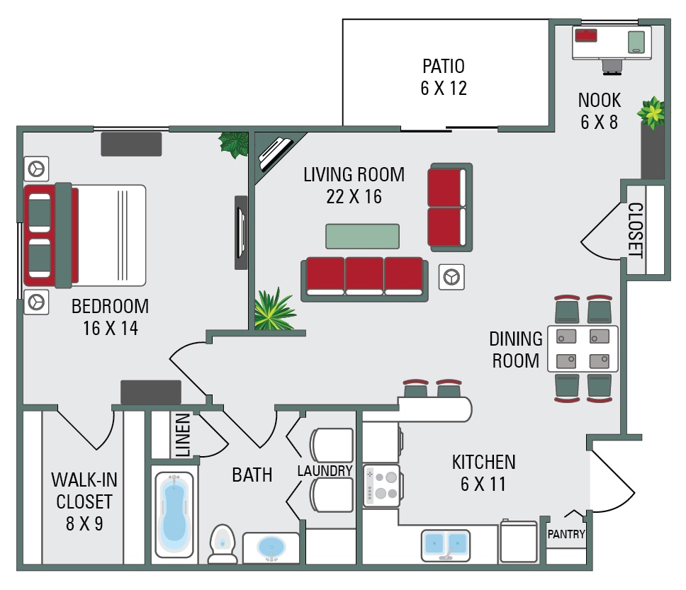 1 Dormitorio, 1 Baño, 1021-1065 pies²El más grandeEsta opción tiene las unidades más grandes para este modeloGalería del Modelo