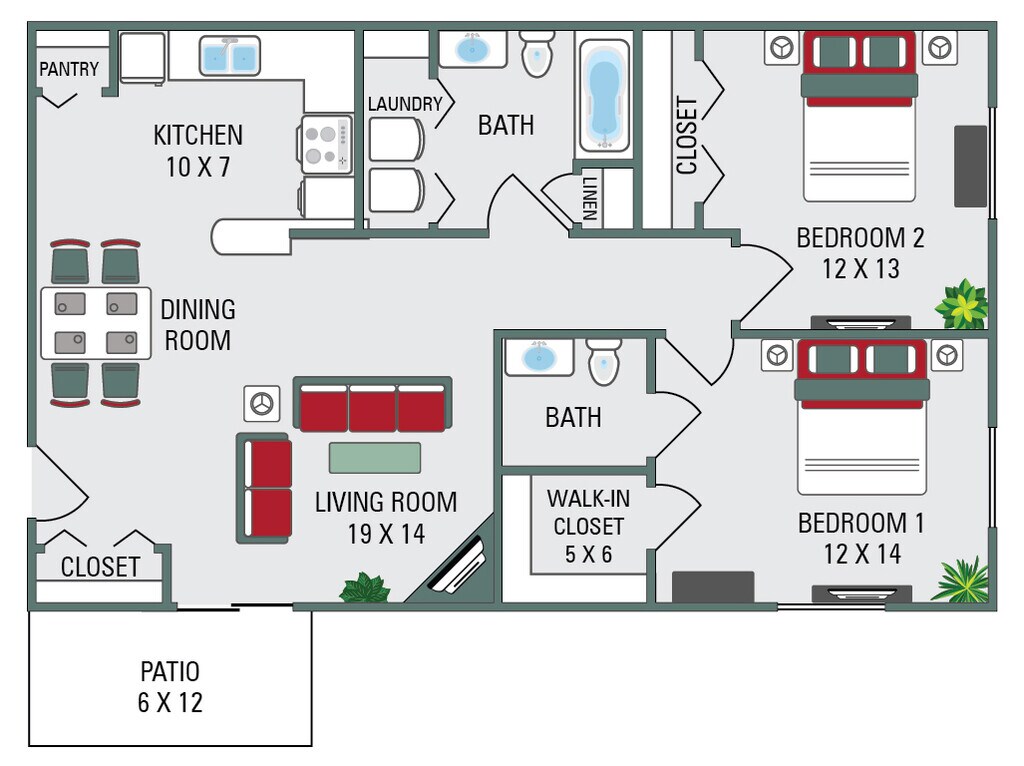 2 Dormitorios, 2 Baños, 1375 pies²Disponible Oct 20El más grandeEsta opción tiene las unidades más grandes para este modeloGalería del Modelo