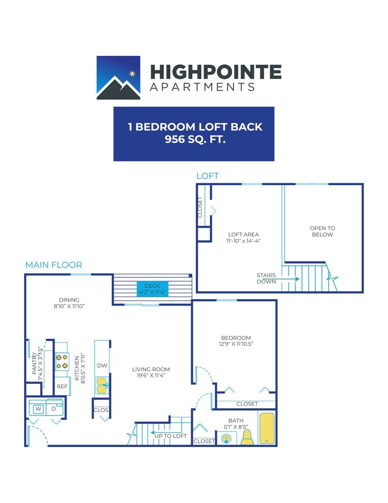 Modelo de apartamento: 1 Bed, 1 Bath Loft - 956 sq ftDesde $1,2701 Dormitorio, 1 Baño, 956 sq ftNo Disponible1 Bed, 1 Bath Loft - 956 sq ft - Plano 1 2 Dormitorios