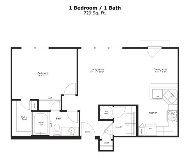 1 Dormitorio, 1 Baño, 729 pies²Galería del Modelo