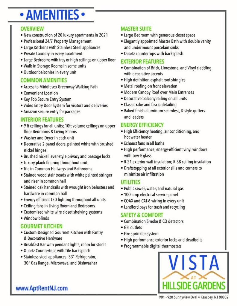 ECHA UN VISTAZO A LA COLECCIÓN VISTA - ¡NUEVA CONSTRUCCIÓN DE APARTAMENTOS DE 1 Y 2 HABITACIONES! Bienvenido a Hillside Garden Apartments, un hermoso lugar para vivir en una de las ubicaciones más cómodas de Nueva Jersey. Este moderno complejo de apartamentos espaciosos y bien diseñados de una, dos o 3 habitaciones está ubicado en un tranquilo entorno tipo parque con árboles frondosos y un vasto predio con césped bien cuidado. Esta atmósfera relajada crea un ambiente que disfrutan los ejecutivos ocupados y las familias. Hillside Garden Apartments ofrece una gran cantidad de experiencias recreativas y de compras. Piensa, puedes disfrutar de todo esto y aun estar cerca de lo principal de Nueva Jersey o a una hora de Nueva York.