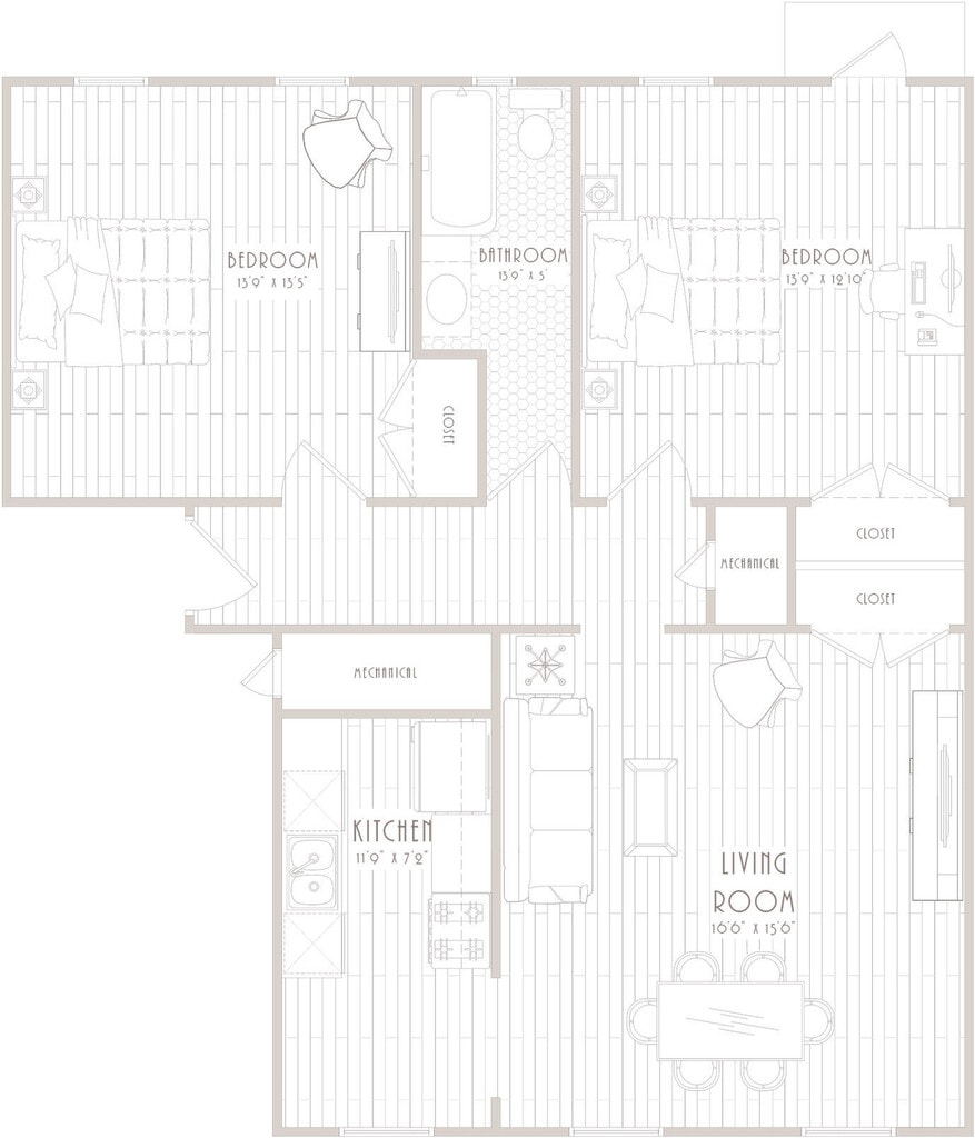 2 Dormitorios, 1 Baño, 965 pies²Galería del Modelo