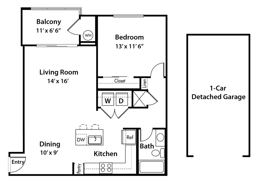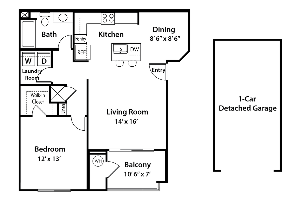 1 Dormitorio, 1 Baño, 763 pies²Galería del Modelo