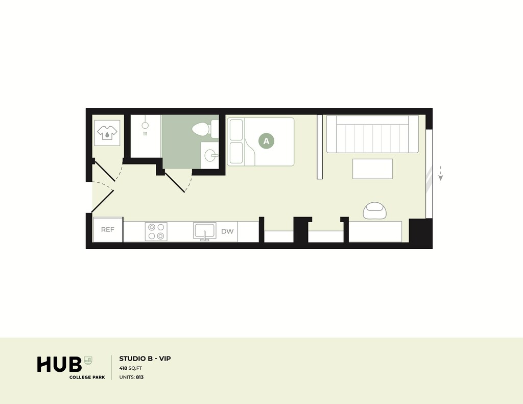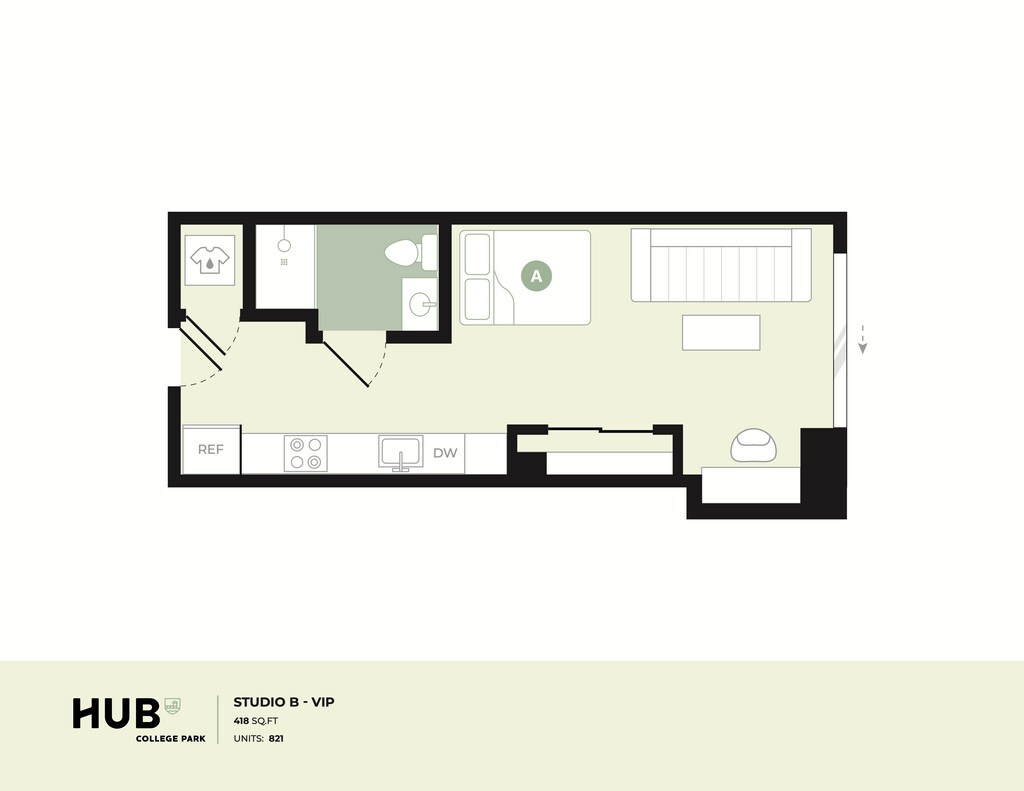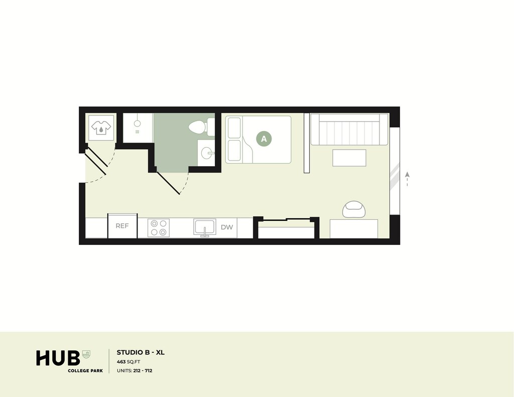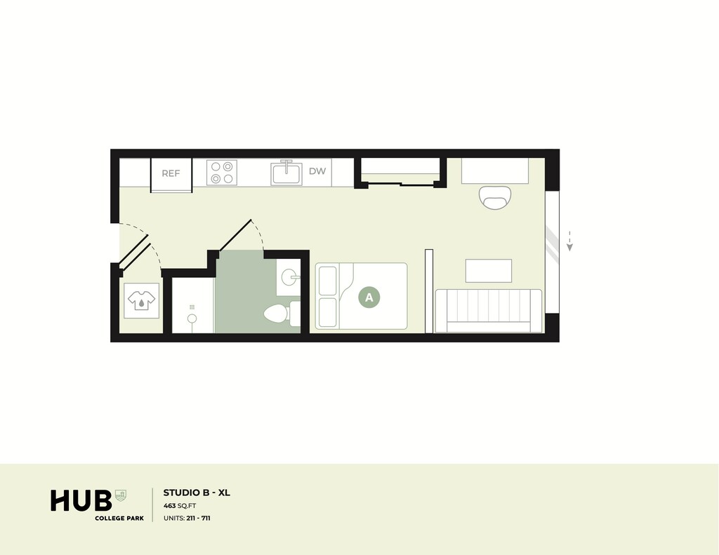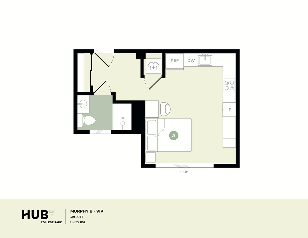 Murphy A - Plano 2 Unidad de apartamento: VIP, Single-PrivateModelo de apartamento: Murphy A$2,049Estudio, 1 Baño, 369 sq ftDisponible August 24, 2026Studio A