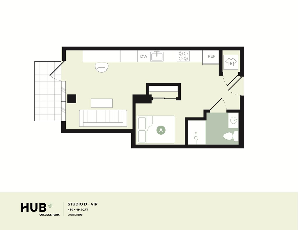 Studio D - Plano 1 Unidad de apartamento: VIP, Single-PrivateModelo de apartamento: Studio D$2,239Estudio, 1 Baño, 480 sq ftDisponible August 24, 2026Studio E