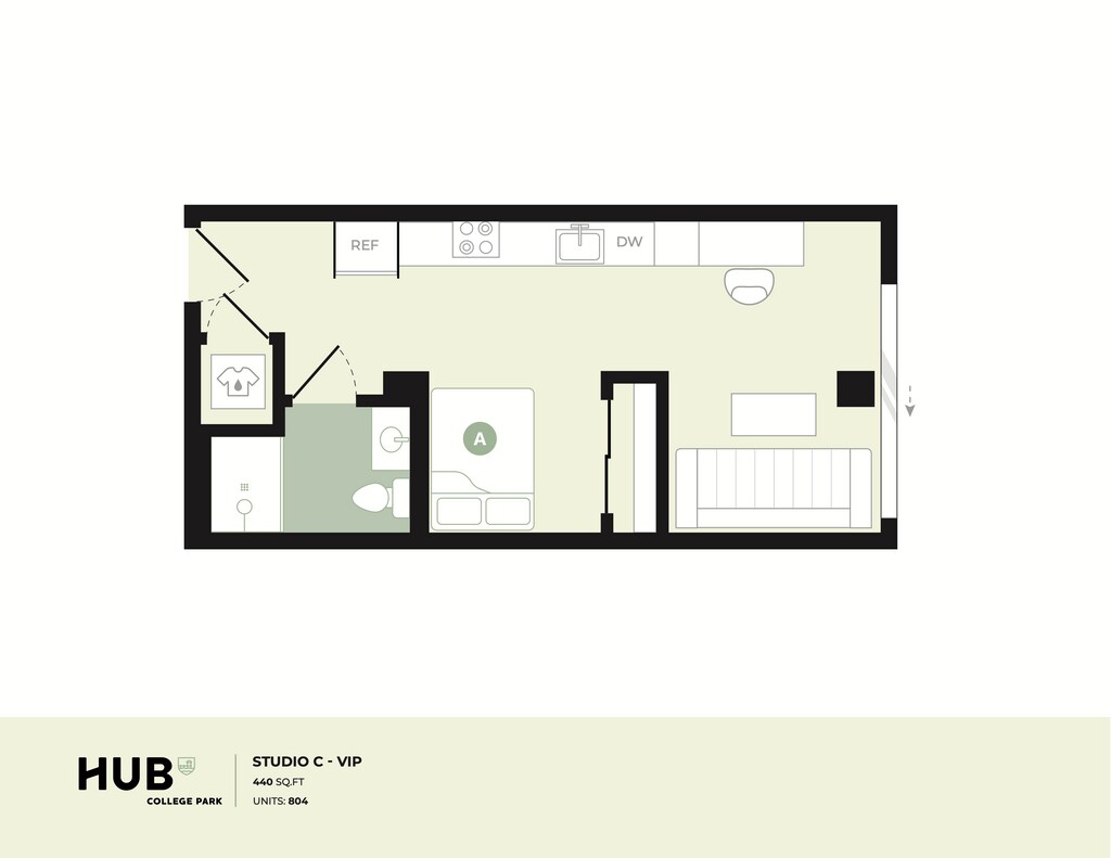Studio C - Plano 1 Unidad de apartamento: VIP, Single-PrivateModelo de apartamento: Studio C$2,209Estudio, 1 Baño, 440 sq ftDisponible August 24, 2026Studio D