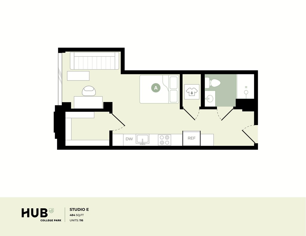 Studio E - Plano 1 Unidad de apartamento: Standard, Single-PrivateModelo de apartamento: Studio E$2,189Estudio, 1 Baño, 484 sq ftDisponible August 24, 20261 Dormitorio