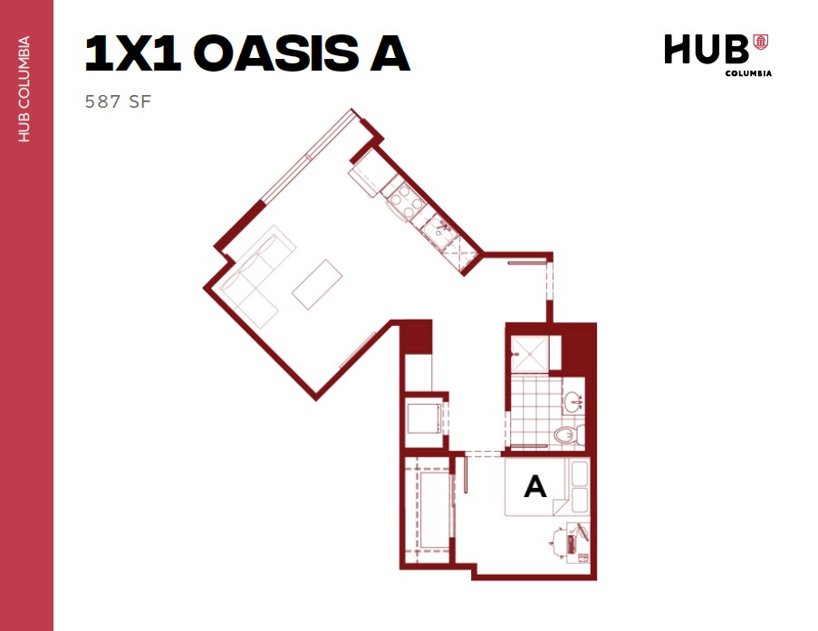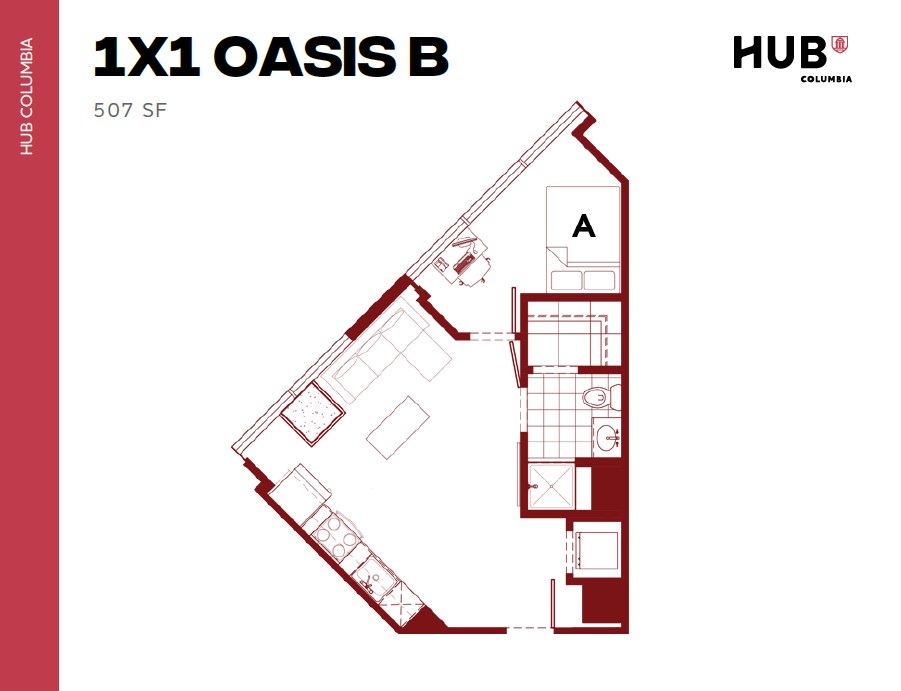 1x1 Oasis - Plano 2 Unidad de apartamento: InteriorModelo de apartamento: 1x1 Oasis1 Dormitorio, 1 Baño, 507-587 sq ftDisponible August 15, 20261X1 A