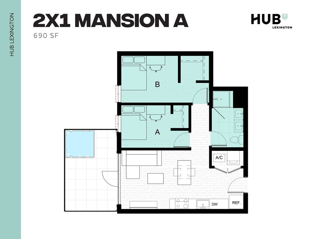 2x1 Mansion - Plano 1 Unidad de apartamento: PrivateModelo de apartamento: 2x1 Mansion2 Dormitorios, 1 Baño, 690 sq ftDisponible August 20, 20262x1 Lite VIP