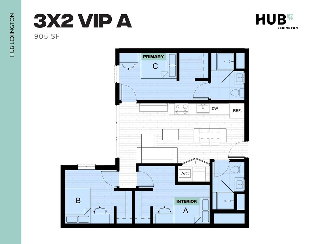 Modelo de apartamento: 3x2 VIP3 Dormitorios, 2 Baños, 905 sq ftDisponible August 20, 2026![]()